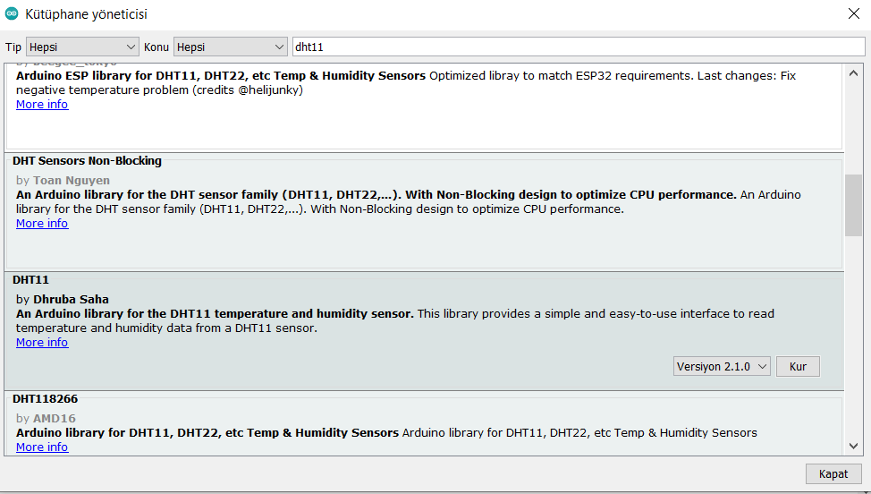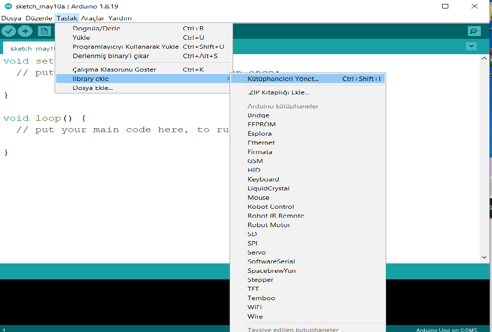 Arduino Kütüphane(Library) Nedir ?Günümüz teknolojisinde arduino için üretilen sensör, modül gibi birden fazla elektronik devre elemanı bulunmaktadır. Bu elektronik devre elemanlarını arduinoya daha kolay bağlamak ve kullanabilmek için kütüphaneler kullanılır. Örneğin bir sensörün birden fazla üreticisi olduğu için kütüphaneler farklılık gösterebilir. Bu yüzden arduino ile proje yaparken kullanılan sensörün üretici firmasının yayınladığı kütüphaneyi kullanmak gerekir. İnternette kütüphane konusunda çok fazla hazır kaynak vardır, isterseniz kendi yazdığınız kütüphaneleri de arduino ıde’ye ekleyebilirsiniz. Hazır Kütüphaneleri Otomatik EklemekArduino ıde programını bilgisayara yüklerken içinde hazır bazı kütüphanelerin paketleri bulunur. Bu kütüphaneleri kullanabilmek için öncelikle arduino ıde üzerinden paketi indirmemiz gerekiyor. Yapmamız gereken işlemler sırasıyla şu şekilde; Arduino ıde programını çalıştıralım ve menü kısmından “Taslak > Library ekle > Kütüphaneleri yönet… “ Segmelerini takip ederek kütüphane yöneticisini açalım. “Crtl+Shfit+I” Kısa yolunu kullanarak da kütüphane yöneticisini açabilirsiniz.