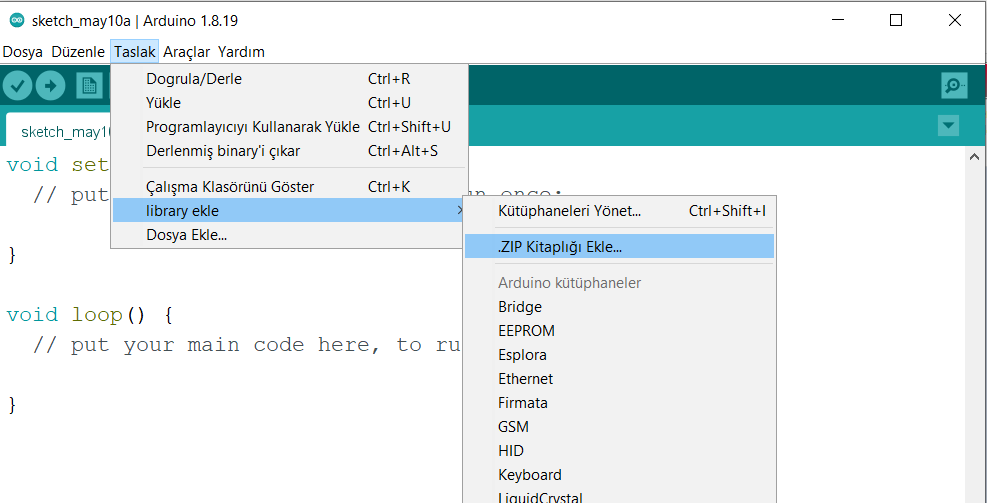 Yüklemek istediğniz kütüphaneyi bulduktan sonra “Versiyon” kısmından güncel olan versiyonu seçerek “Kur” seçeneğini seçerek kütüphaneyi kuruyoruz. Normalde arduino ıde programı çalışırken internete ihtiyaç duymaz, ancak kütüphaneyi kurarken internet bağlantısı olması gerekir. Bu şekilde yüklenen kütüphanelerin güncelleme işlemini de bu pencereden “Versiyon” kısmından güncel olan versiyonu kurarak güncelleme işlemini yapmış oluyoruz. Kütüphaneyi yükledikten ya da güncelleme işlemi yaptıktan sonra arduino ıde programını kapatıp tekrar açın. ZIP Dosyasından Kütüphaneyi Eklemekİstediğiniz kütüphane arduino ıde programı içinde bulunmuyorsa birçok arduino kullanıcısının internette paylaştığı kütüphaneler ile bunu bulmanız mümkün. Uygun olan kütüphaneyi bulduktan sonra zıp dosyasını bilgisayarınıza indirin. İnternette bulunan kütüphaneler genellikle zıp dosyası şeklinde olur. Eğer zıp dosyası şeklinde değilse “Manuel Yükleme” yaparak kütüphaneyi arduino ıde’ye yüklerseniz daha sağlıklı olacaktır. Arduino IDE programını çalıştıralım ve menü kısmından “Taslak > Library ekle > Zıp Kitaplığı Ekle…“ Menülerini takip ederek zıp kütüphanesi yükleme penceresini açalım.